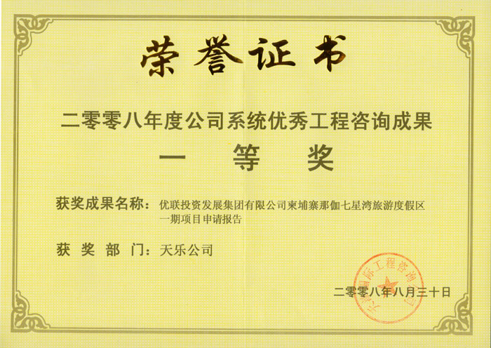 2008年 | 公司系統優(yōu)秀工程咨詢(xún)成果一等獎 | 天津優(yōu)聯(lián)投資發(fā)展集團有限公司柬埔寨那伽七星灣旅游度假區一期項目申請報告 |