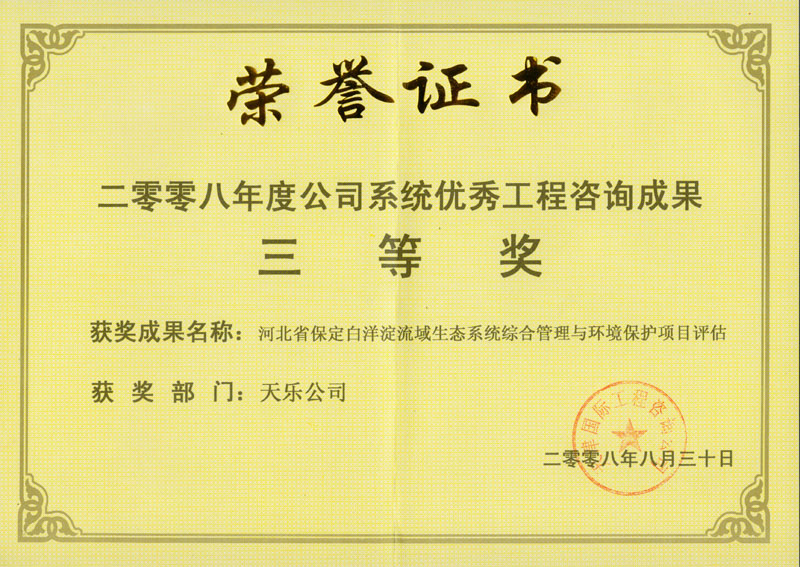 2008年 | 公司系統優(yōu)秀工程咨詢(xún)成果三等獎 | 河北省保定白洋淀流域生態(tài)系統綜合管理與環(huán)境保護項目評估 |