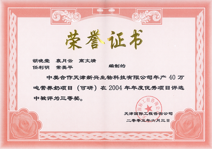 2004年 | 公司系統優(yōu)秀項目評選三等獎 | 中美合作天津新興生物科技有限公司年產(chǎn)40萬(wàn)噸營(yíng)養奶項目(可研) |