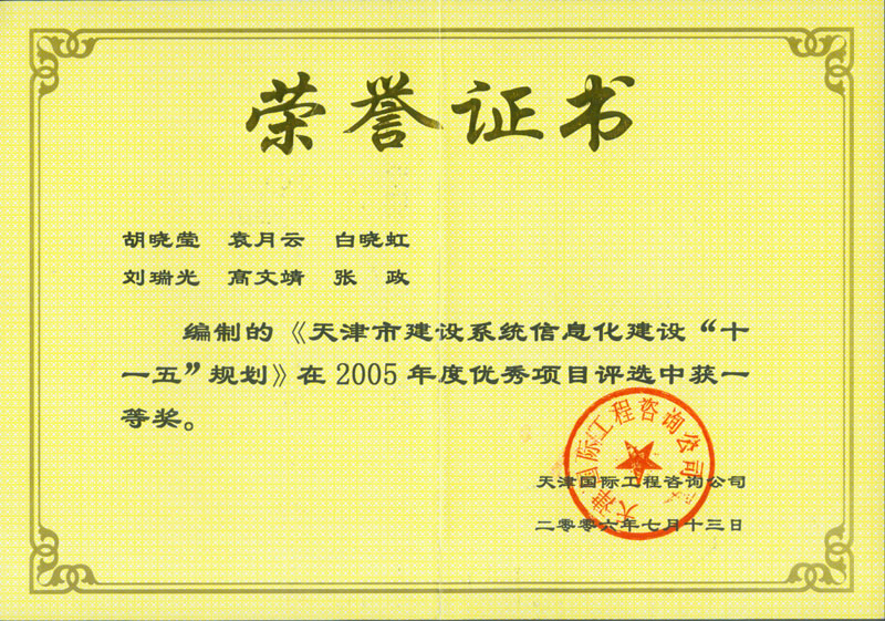 2005年 | 公司系統優(yōu)秀項目評選一等獎 | 天津市建設系統信息化建設“十一五”規劃 |