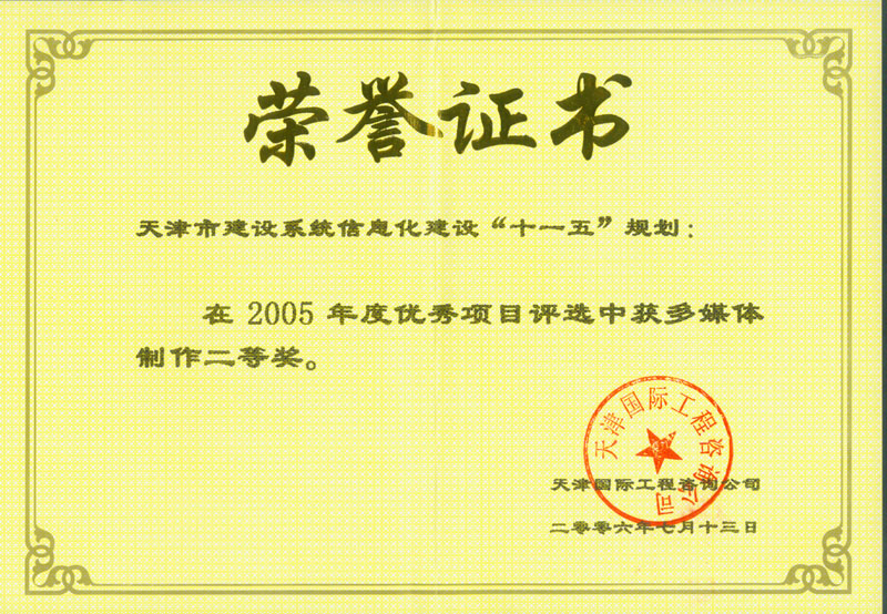 2005年 | 公司系統優(yōu)秀項目評選多媒體制作二等獎 | 天津市建設系統信息化建設“十一五”規劃 |