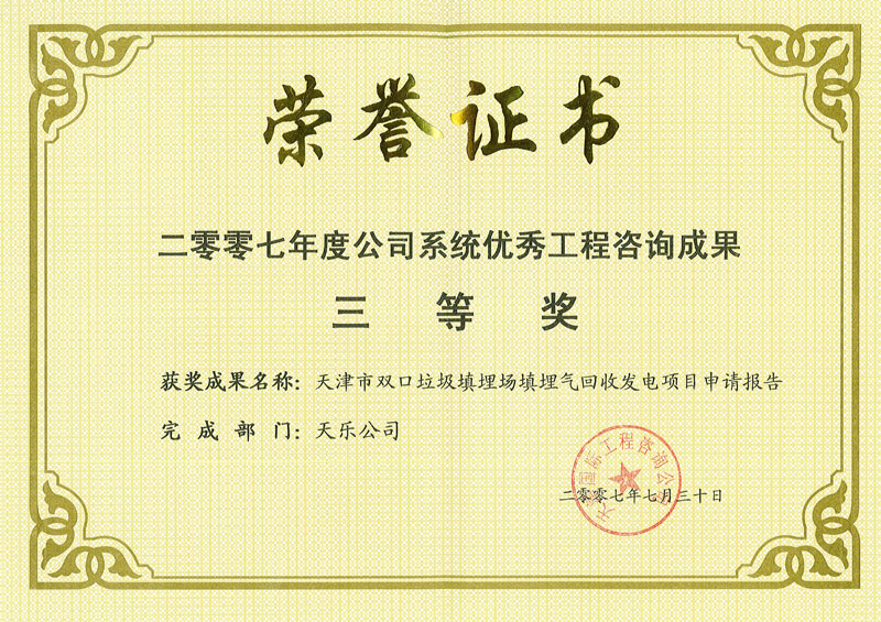 2007年 | 公司系統優(yōu)秀工程咨詢(xún)成果三等獎 | 天津市雙口垃圾填埋場(chǎng)填埋氣回收發(fā)電項目申請報告 |