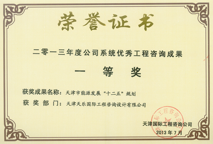 2013年 | 公司系統優(yōu)秀工程咨詢(xún)成果一等獎 | 天津市能源發(fā)展“十二五”規劃 |