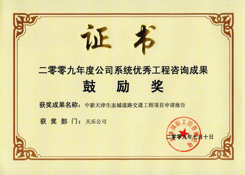 2009年 | 公司系統優(yōu)秀工程咨詢(xún)成果鼓勵獎 | 中新天津生態(tài)成道路交通工程項目申請報告 |