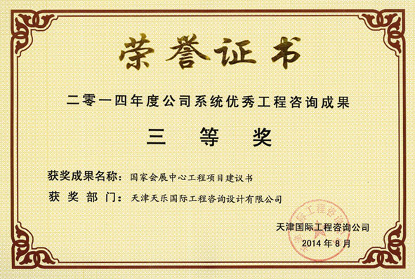 2014年 | 公司系統優(yōu)秀工程咨詢(xún)成果三等獎 | 國家會(huì )展中心工程項目建議書(shū) |