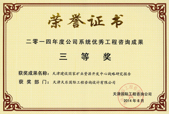 2014年 | 公司系統優(yōu)秀工程咨詢(xún)成果三等獎 | 天津建設國家礦業(yè)資源開(kāi)發(fā)中心戰略研究報告 |