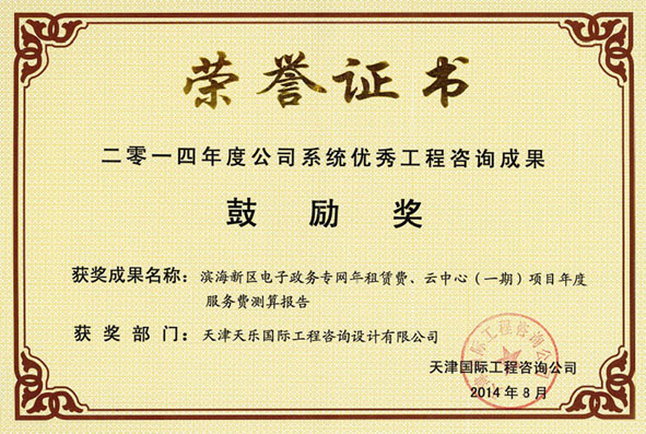 2014年 | 公司系統優(yōu)秀工程咨詢(xún)成果鼓勵獎 | 濱海新區電子政務(wù)專(zhuān)網(wǎng)年租賃費、云中心(一期)項目年度服務(wù)費測算報告 |