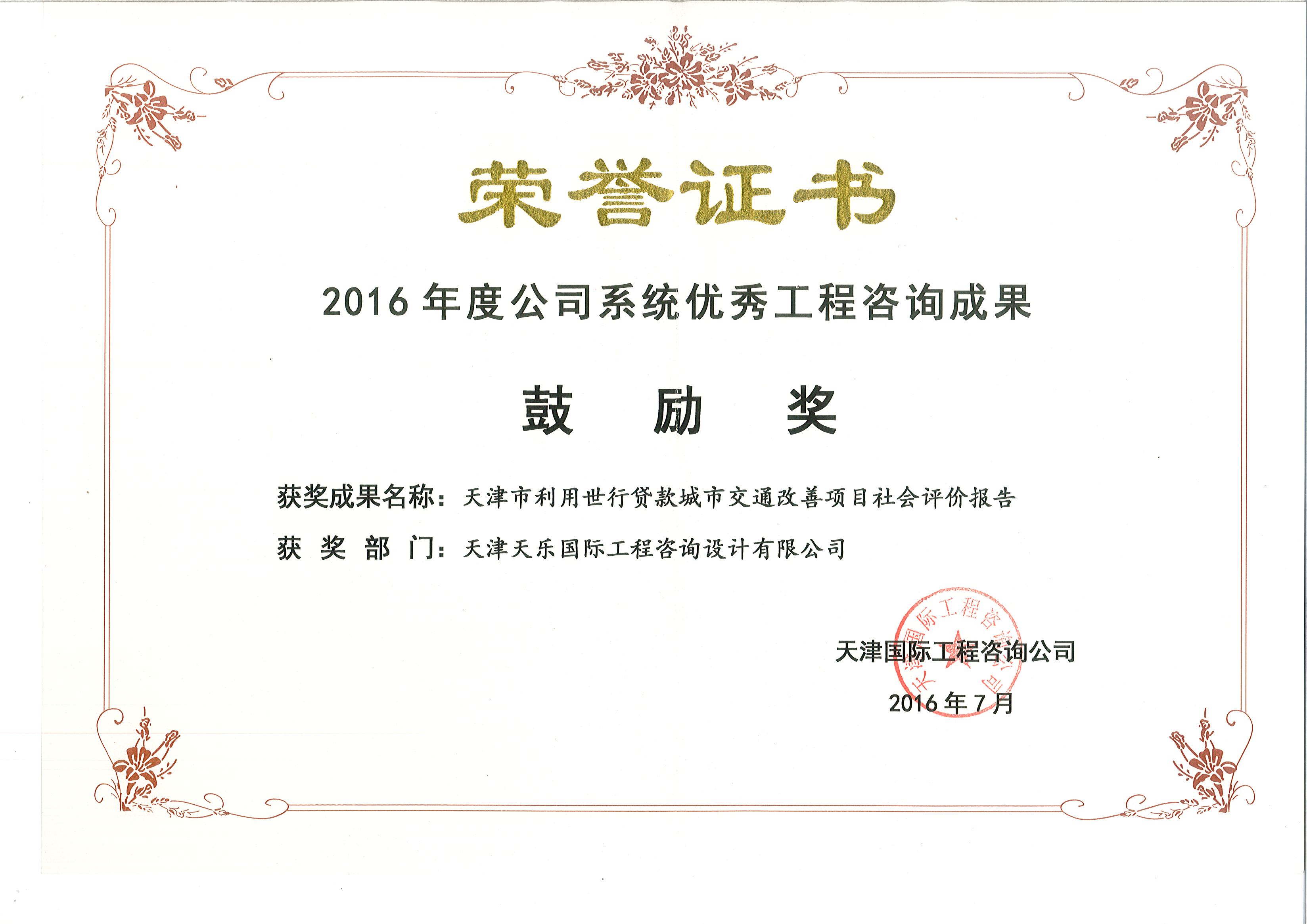 2007年 | 公司系統優(yōu)秀工程咨詢(xún)成果一等獎 | 世行貸款第一批天津市發(fā)展和環(huán)境項目后評估報告 |