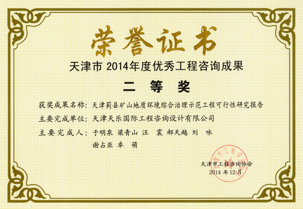 2014年 | 天津市優(yōu)秀工程咨詢(xún)成果二等獎 | 天津薊縣礦山地質(zhì)環(huán)境綜合治理示范工程可行性研究報告 |