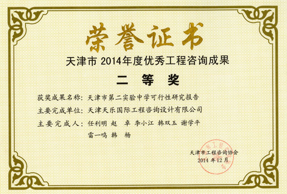 2014年 | 天津市優(yōu)秀工程咨詢(xún)成果二等獎 | 天津市第二實(shí)驗中學(xué)可行性研究報告 |