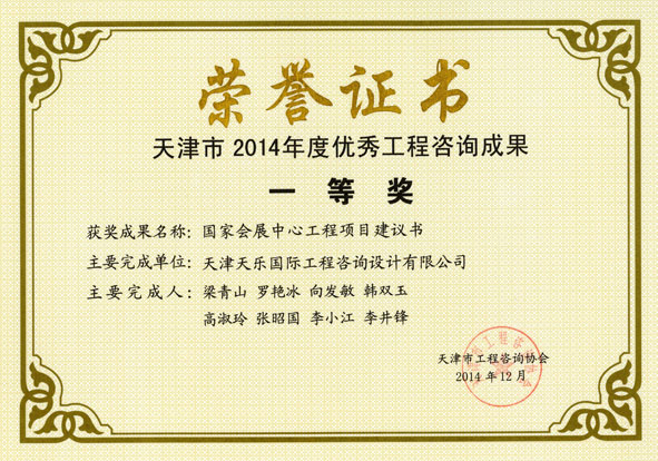 2014年 | 天津市優(yōu)秀工程咨詢(xún)成果一等獎 | 國家會(huì )展中心工程項目建議書(shū) |