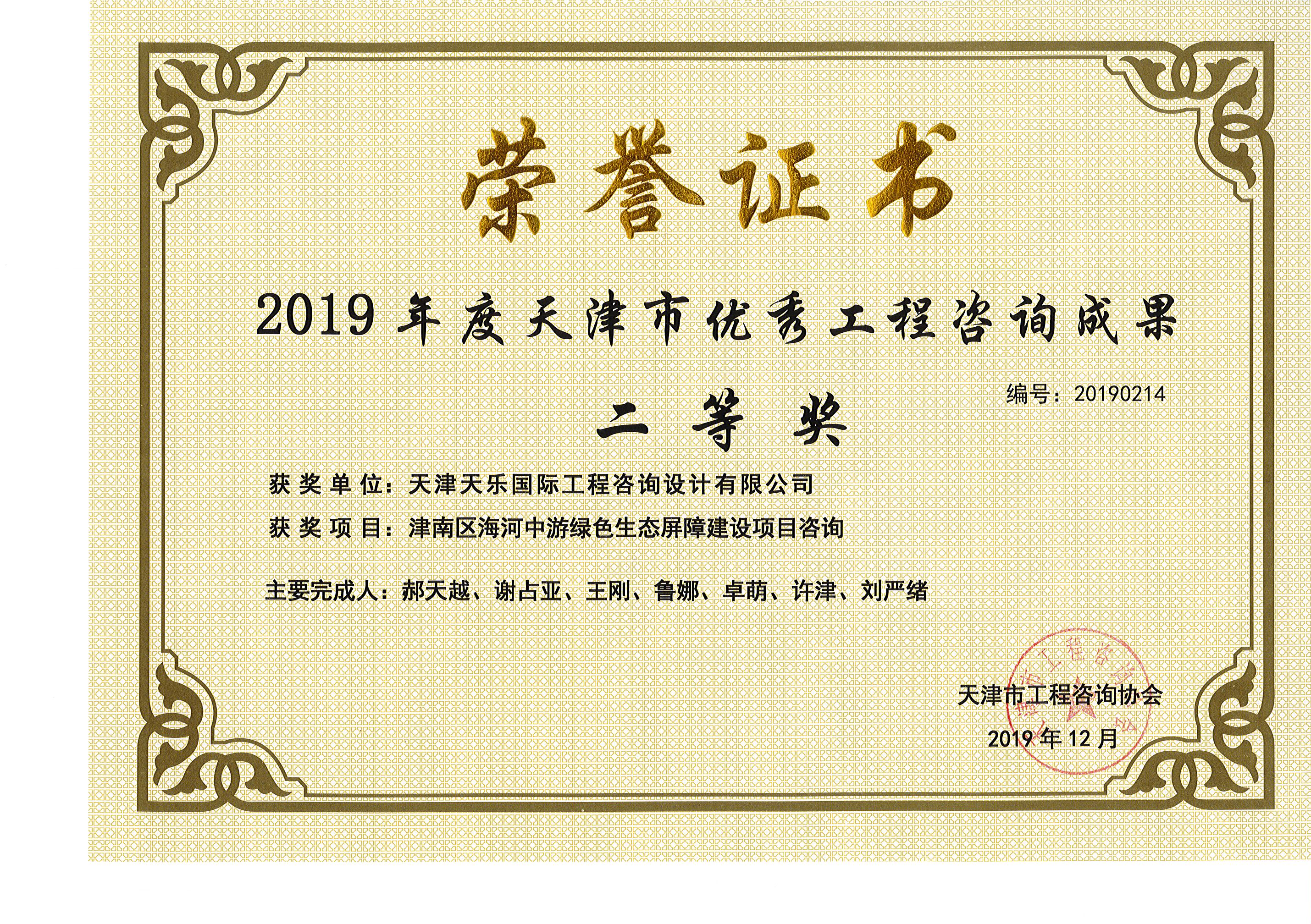2019年 | 天津市優(yōu)秀工程咨詢(xún)成果二等獎 | 津南區海河中游綠色生態(tài)屏障保障建設項目咨詢(xún) |