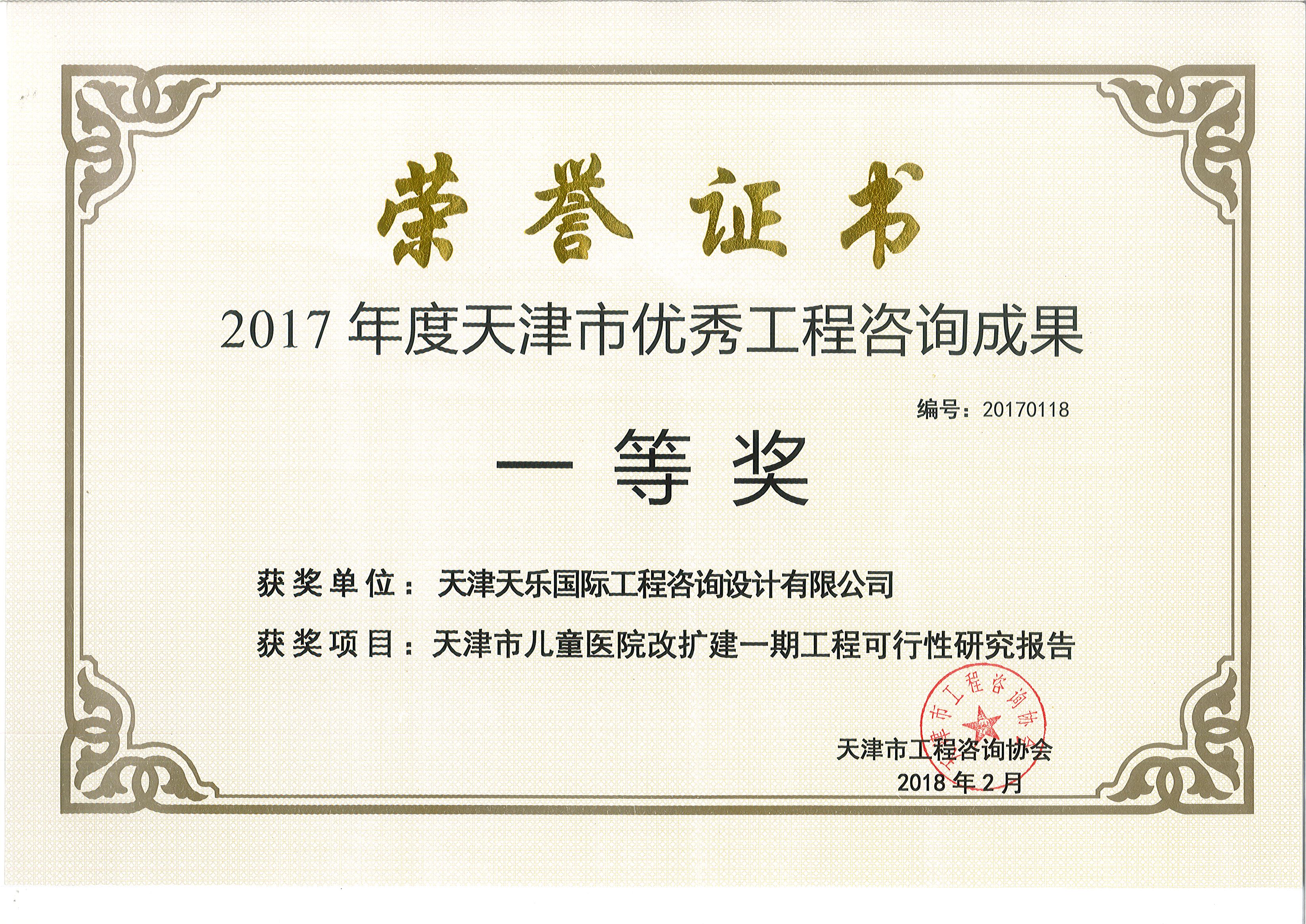2017年 | 天津市優(yōu)秀工程咨詢(xún)成果一等獎 | 天津市兒童醫院改擴建一期工程可行性研究報告 |