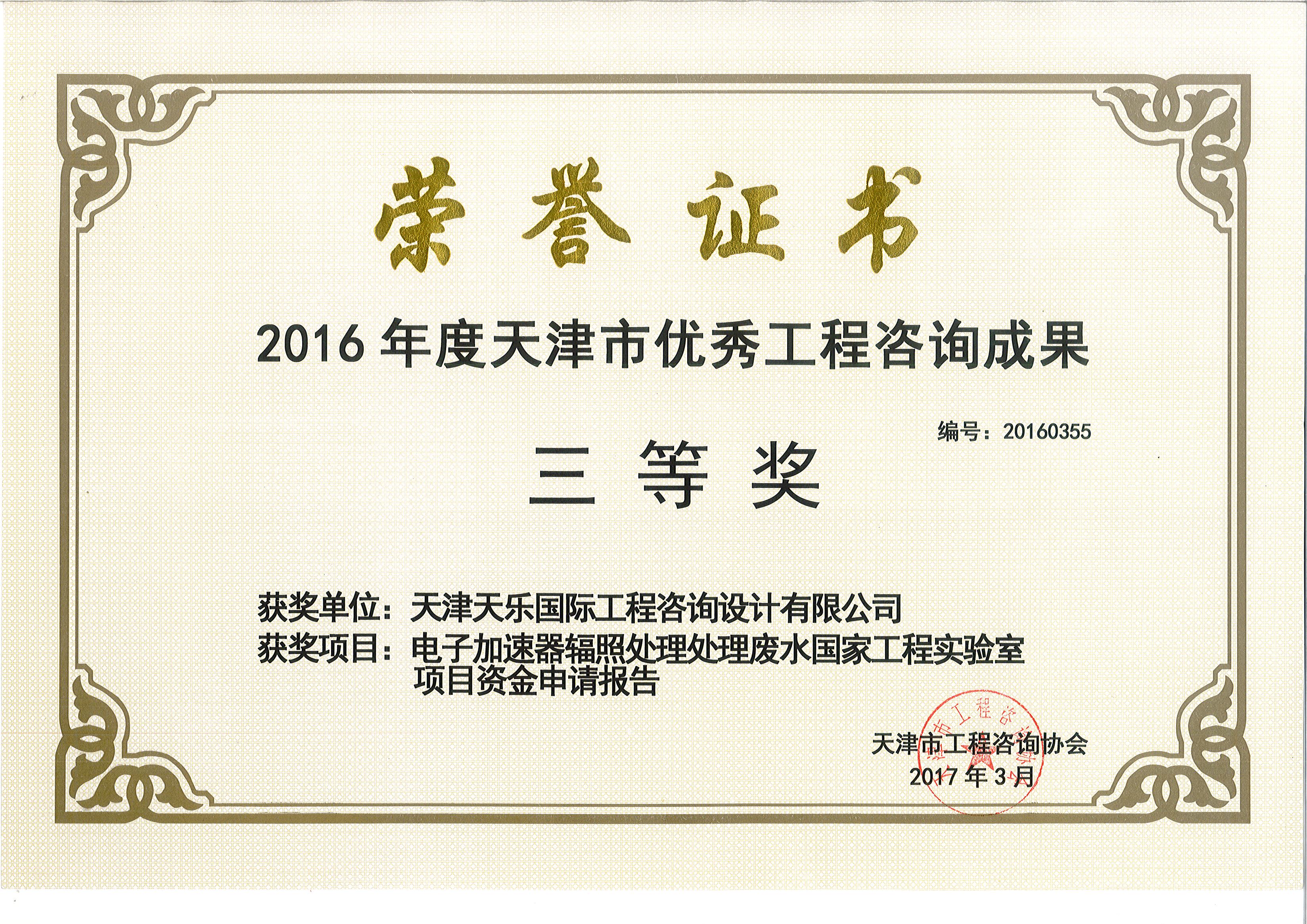 2016年 | 天津市優(yōu)秀工程咨詢(xún)成果三等獎 | 電子加速器輻照處理處理廢水國家工程實(shí)驗室項目資金申請報告 |