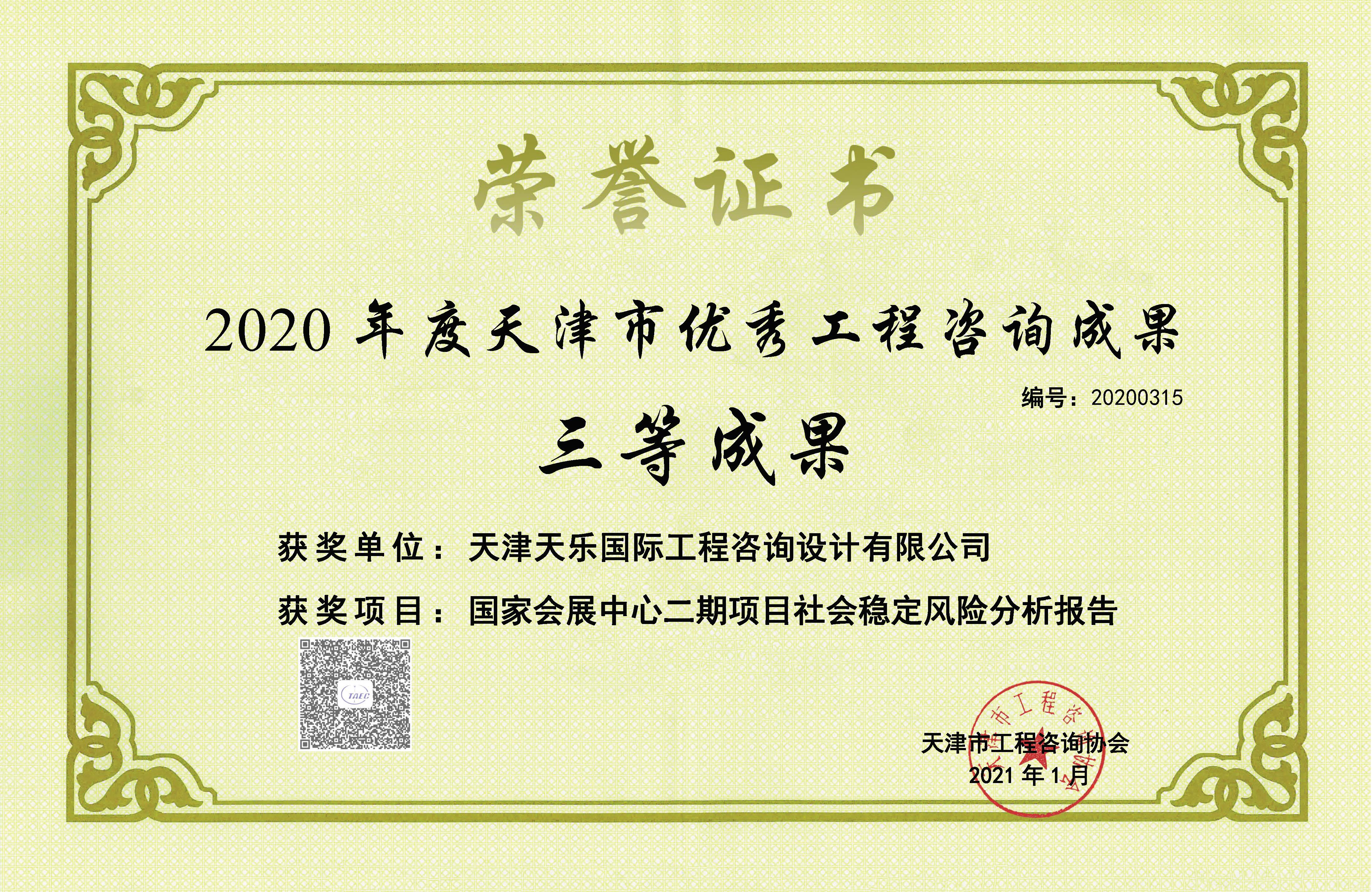 2016年 | 天津市優(yōu)秀工程咨詢(xún)成果三等獎 | 2015年度天津市服務(wù)業(yè)引導資金項目 |
