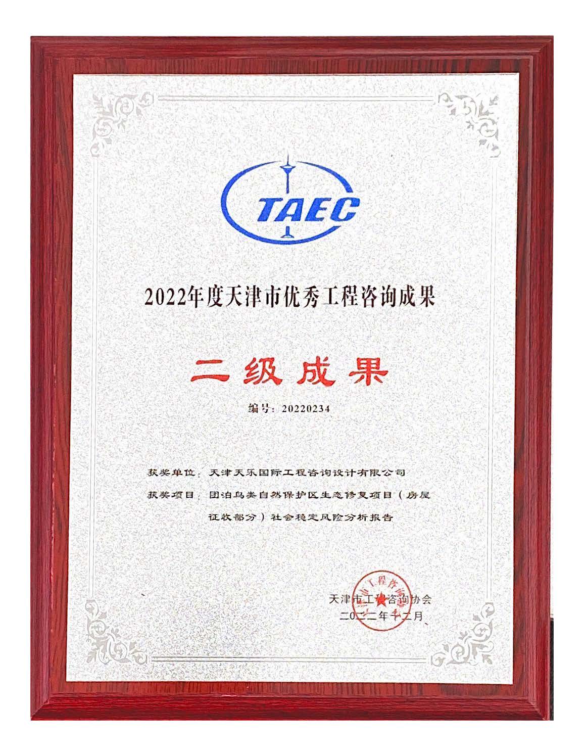 2022年12月,天樂(lè )公司《團泊鳥(niǎo)類(lèi)自然保護區生態(tài)修復項目(房屋征收部分)社會(huì )穩定風(fēng)險分析報告》獲得天津市優(yōu)秀咨詢(xún)成果二等獎。獲此獎項體現了天樂(lè )公司咨詢(xún)業(yè)務(wù)的高度專(zhuān)業(yè)性,也驗證了公司具備高素質(zhì)、高水平的技術(shù)團隊,保證咨詢(xún)成果高質(zhì)量輸出。