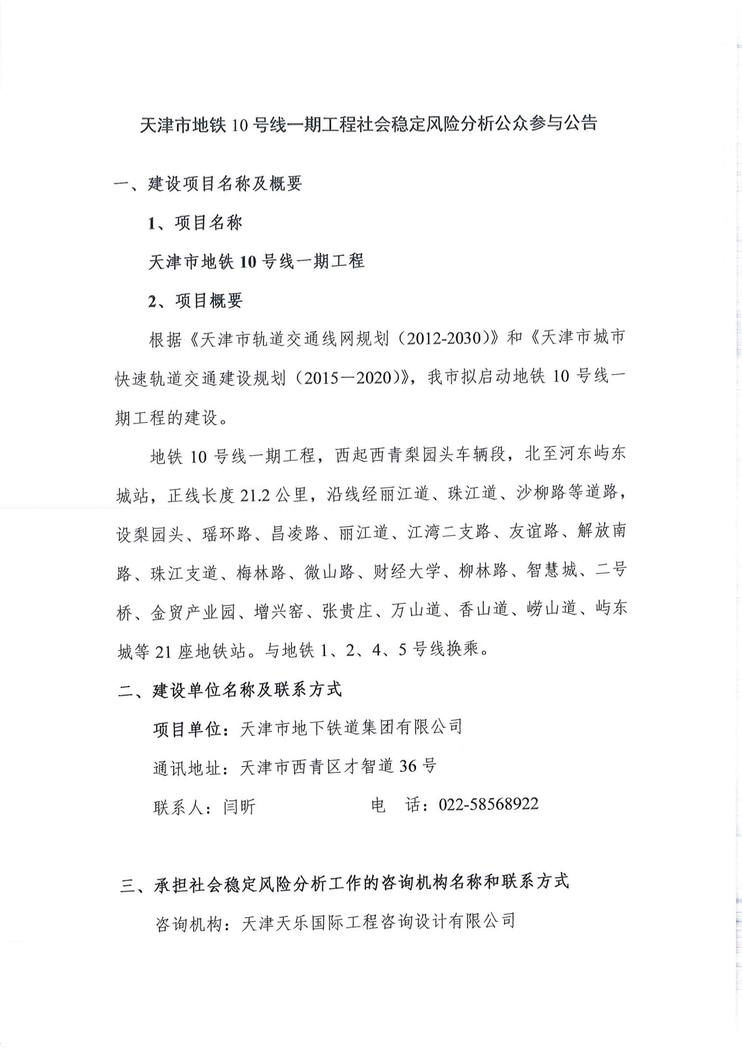 天津市地鐵10號線(xiàn)一期工程社會(huì )穩定風(fēng)險分析