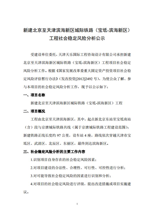 新建北京至天津濱海新區城際鐵路(寶坻-濱海新區)工程社會(huì )穩定風(fēng)險分析