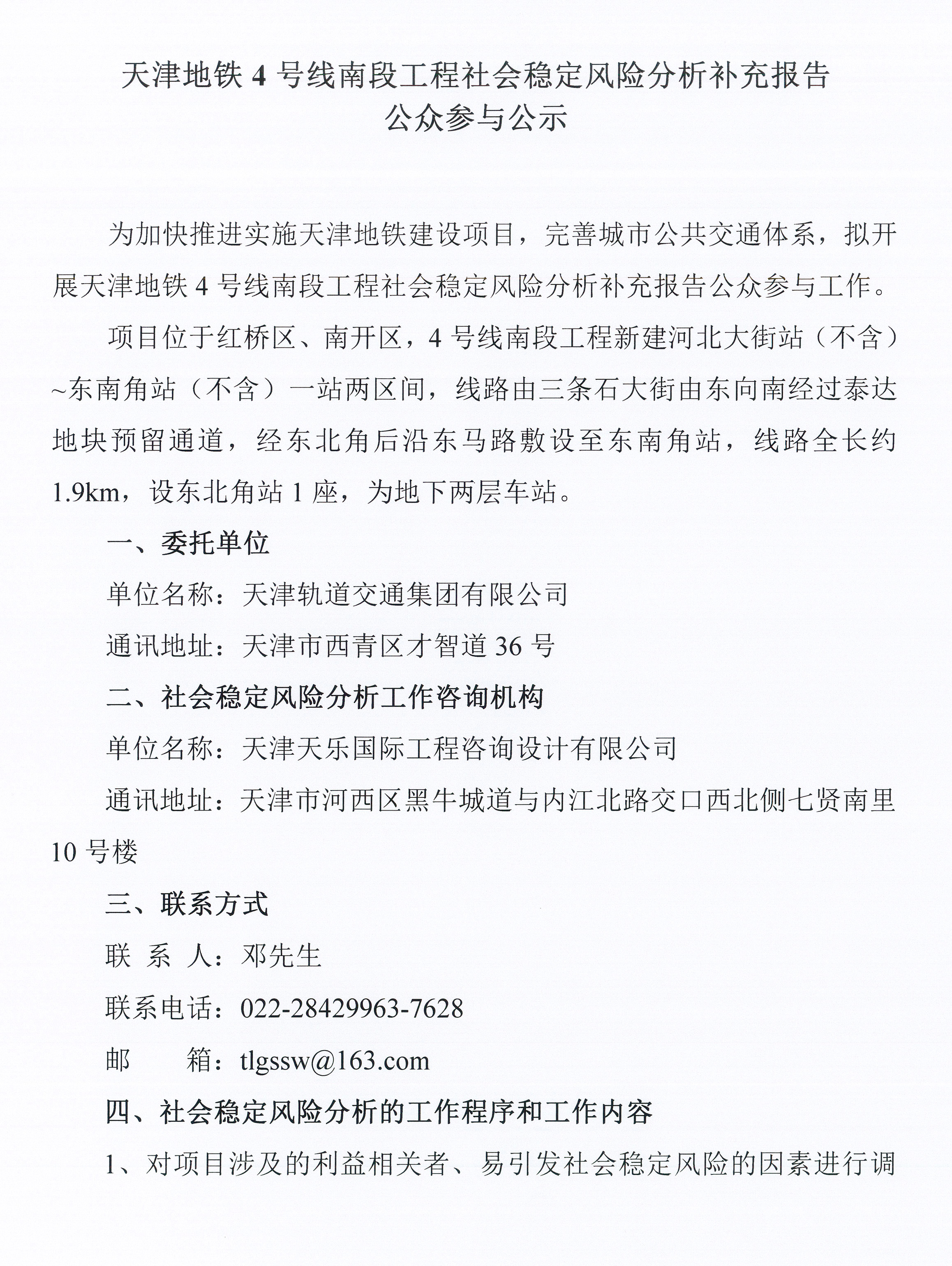 天津地鐵4號線(xiàn)南段工程社會(huì )穩定風(fēng)險分析補充報告