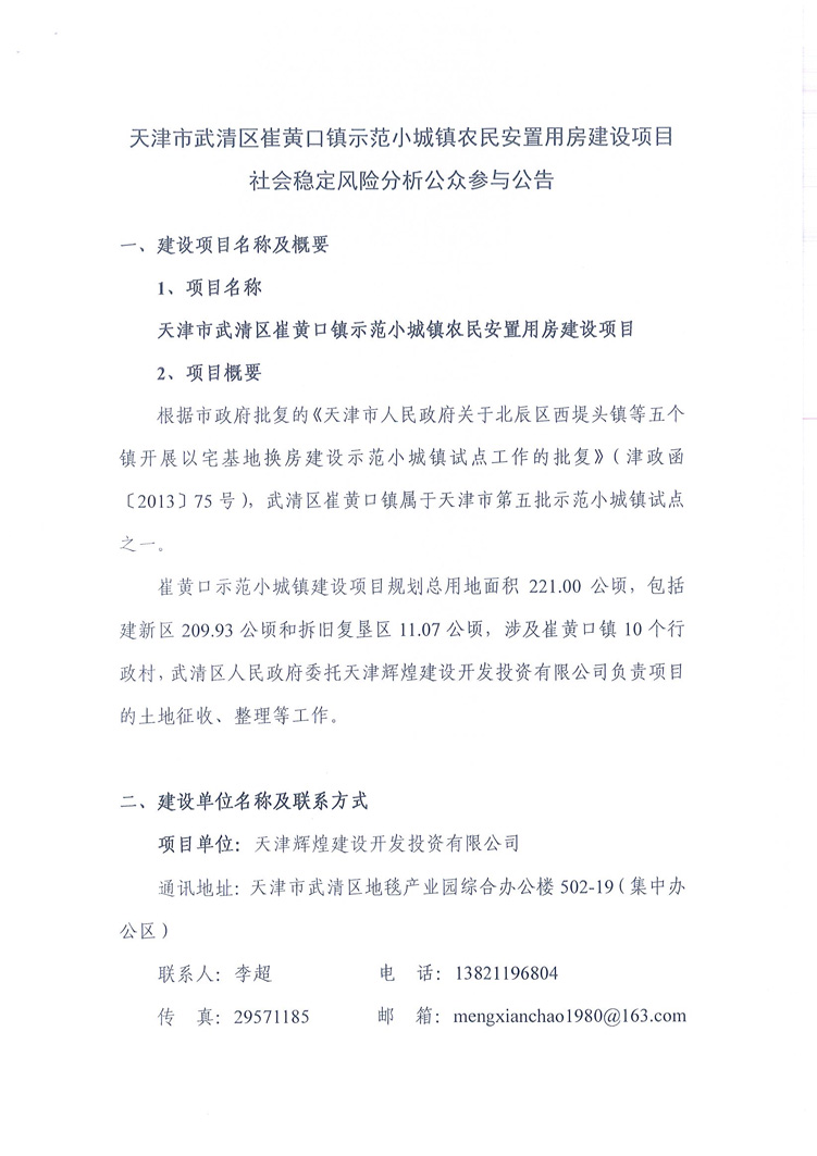 天津市武清區崔黃口鎮示范小城鎮農民安置用房建設項目社會(huì )穩定風(fēng)險分析