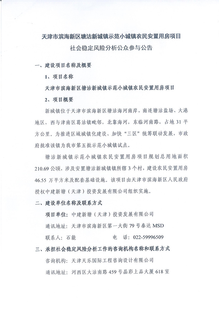 天津濱海新區塘沽新城鎮示范小城鎮農民安置用房項目社會(huì )穩定風(fēng)險分析