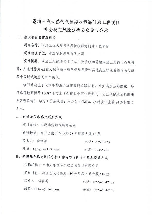 港清三線(xiàn)天然氣氣源接收靜海門(mén)站工程項目社會(huì )穩定風(fēng)險分析