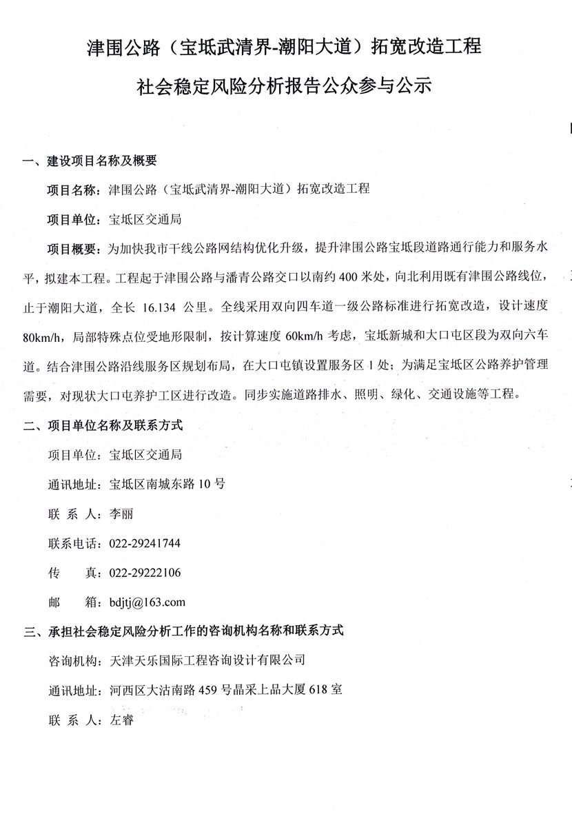 津圍公路(寶坻武清界—潮陽(yáng)大道)拓寬改造工程社會(huì )穩定風(fēng)險分析報告