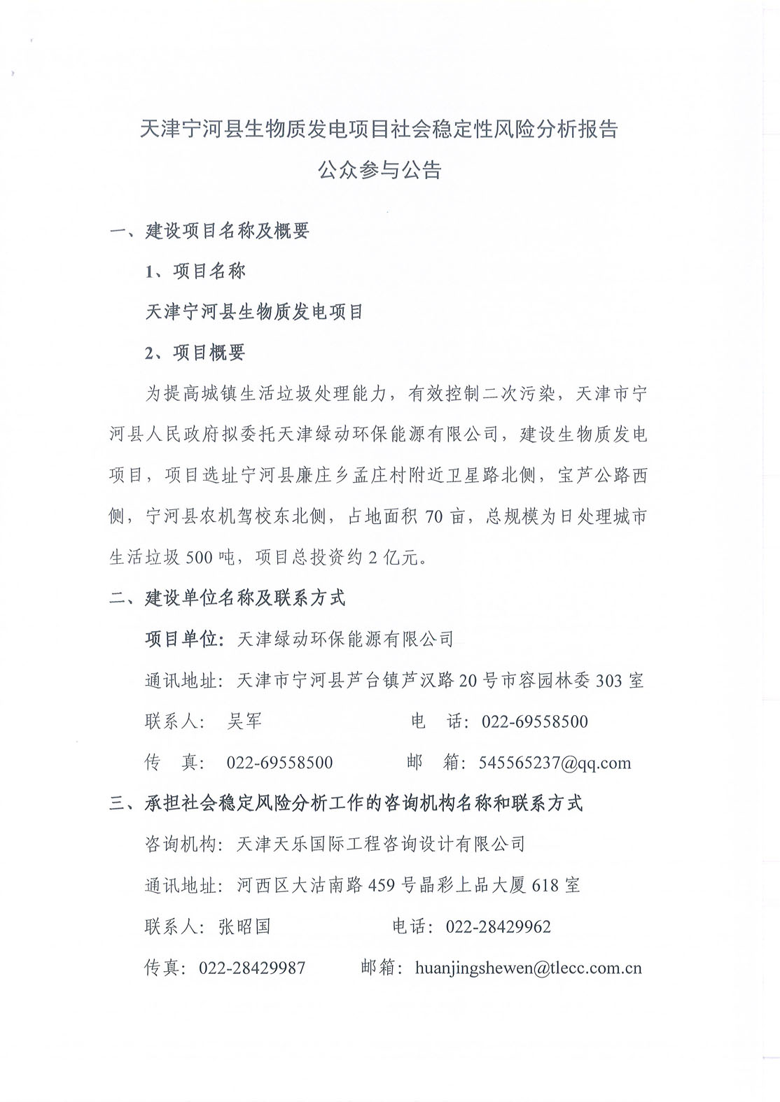 天津寧河縣生物質(zhì)發(fā)電項目社會(huì )穩定性風(fēng)險分析報告