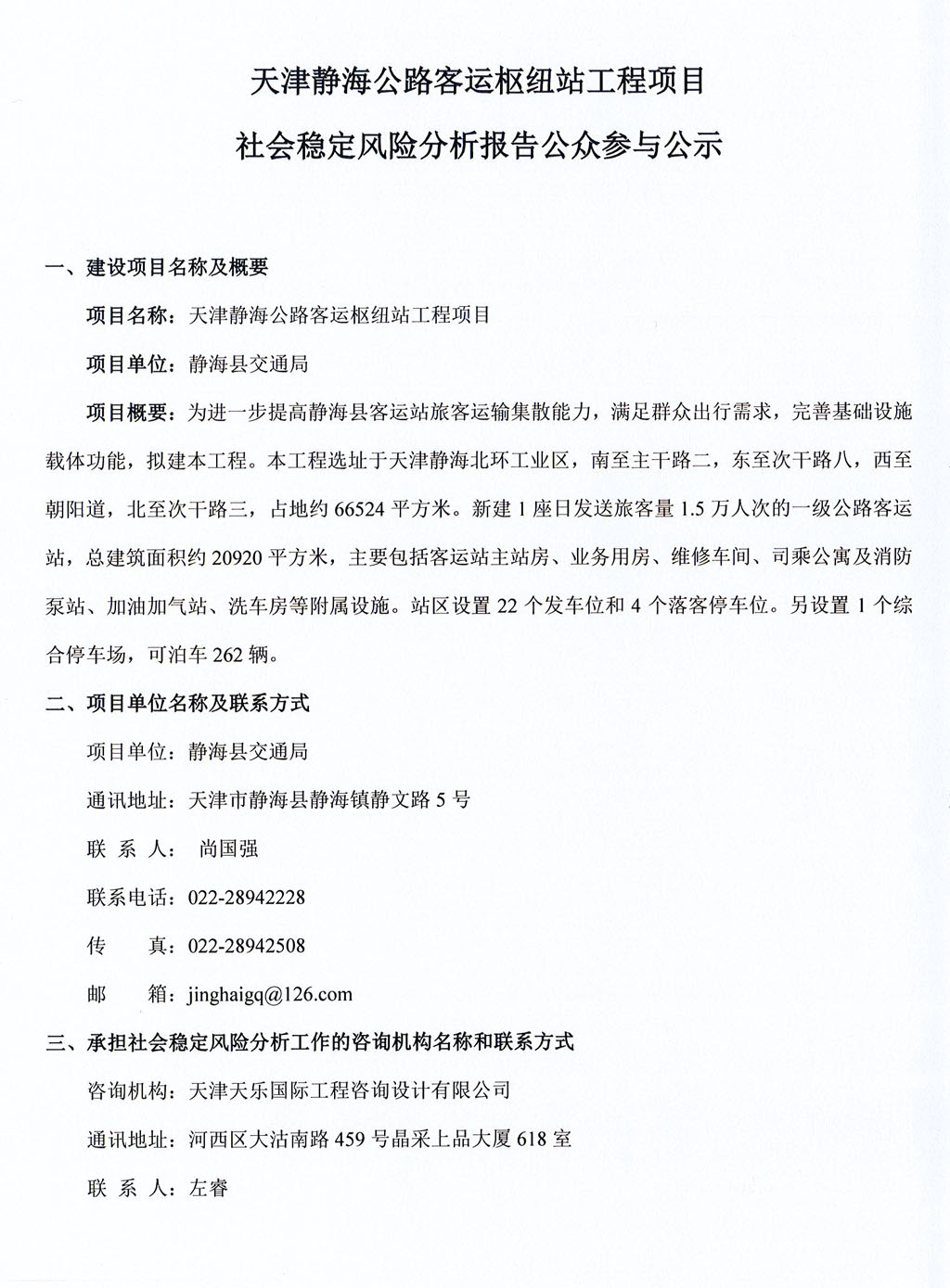 天津靜海公路客運樞紐站工程項目社會(huì )穩定風(fēng)險分析報告